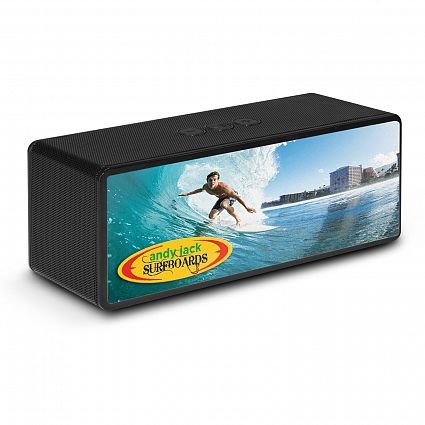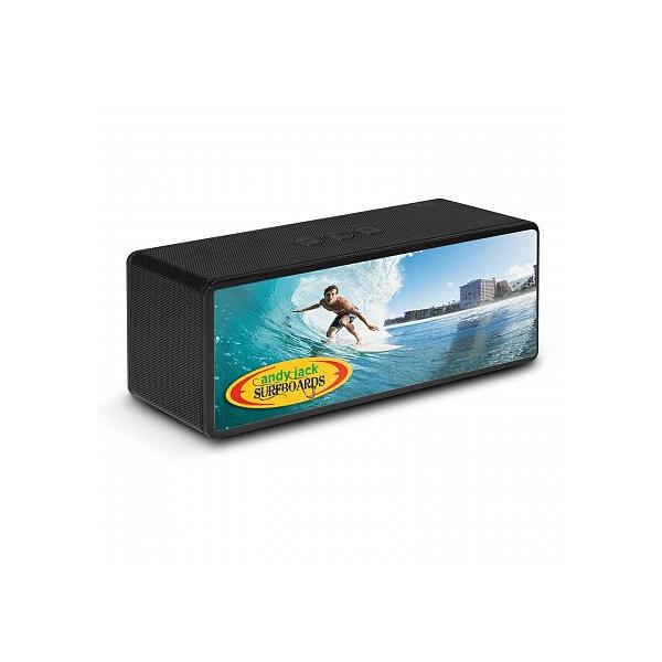 Superior Bluetooth speaker which produces exceptional crystal-clear stereo sound from a dual speaker array with a built in sub-woofer to enhance the bass reproduction. It is equipped with NFC technology (Near Field Communication) which allows compatible devices to pair with the speaker by placing them within proximity. Other features include a built-in microphone for phone and conference calls and music playback can be controlled directly from the speaker. Infinity is compatible with all mobile devices that support Bluetooth and has a wireless connectivity range of over 10 metres with the option to use an audio cable if required. Playing time is 6-8 hours and it is easily recharged from a laptop, a power bank or a USB mains adapter. The front and back panels are designed for spot colour or stunning full colour branding. It is beautifully presented in a gift box with a Micro-B USB cable, an audio cable and an instruction leaflet.