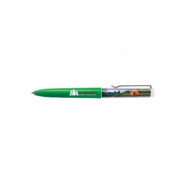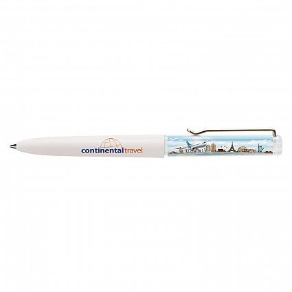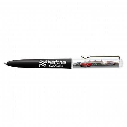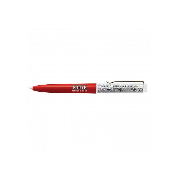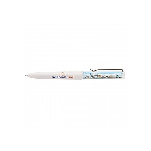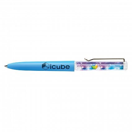 Plastic liquid filled floating action ball pen with a twist mechanism and the choice of a blue or black refill. It features an insert panel which is printed in full colour on both sides along with a floater that is customised in a two dimensional shape and moves vertically when the pen is inverted. The barrel can be manufactured in any PMS colour for an additional charge. A lead time of 30 working days applies to this product by air freight and orders can be sea freighted on request to reduce the freight cost.